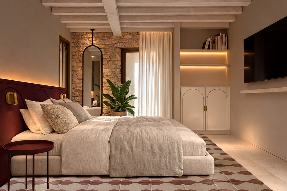 Ogni piano è caratterizzato da una precisa identità cromatica che dialoga con elementi costanti come il muro in sasso a vista, le cementine artigianali dai pattern geometrici e i raffinati dettagli in ottone. Dalla zona giorno alla camera padronale con bagno en suite, ogni ambiente è un equilibrio perfetto tra memoria storica e gusto attuale: boiserie minimali, simmetrie eleganti e l’uso sapiente di marmo e legno definiscono uno spazio cucito su misura.